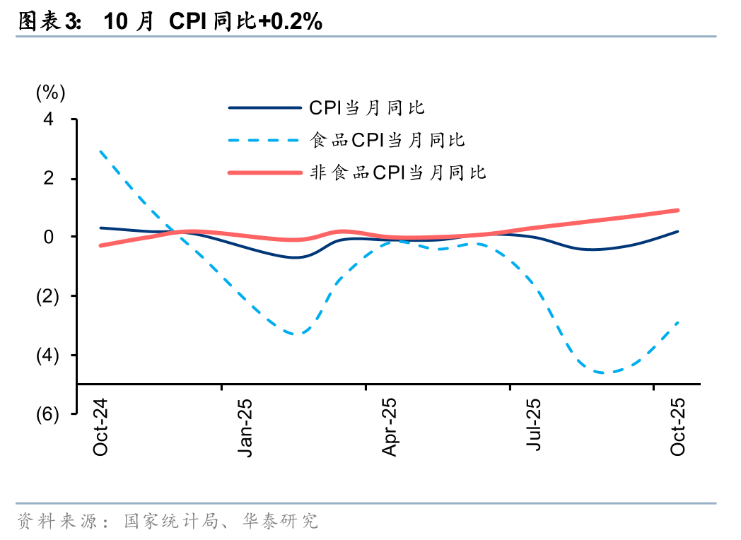 10月CPI 同比+0.2%,涨幅环比扩大0.1pct且略高于季节性水平,主因假日经济带动服务价格,以及促消费及反内卷政策带动工业消费品价格有所回升。10月服务价格环比上涨0.2%,影响CPI环比上涨0.07pct。剔除食品和能源的核心CPI同比+1.2%,涨幅连续第6个月扩大,为2024年3月以来最高。展望后续,市场需求仍待进一步修复。“十五五”规划提出大力提振消费,扩大优质消费品和服务供给,以放宽准入、业态融合为重点扩大服务消费等,我们认为有利于品质消费、体验型消费等加快发展,助力优质国货品牌持续扩大市场份额。相关提振内需措施的落地及细分品类赛道机遇值得关注。