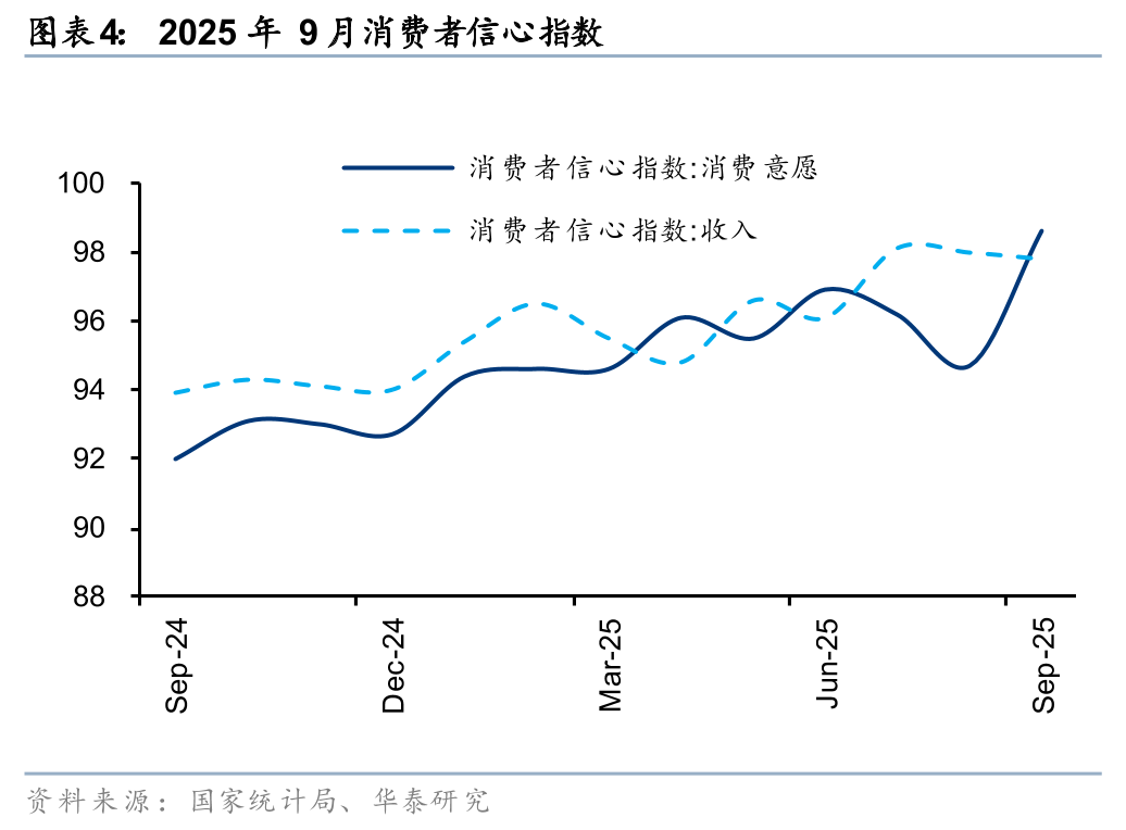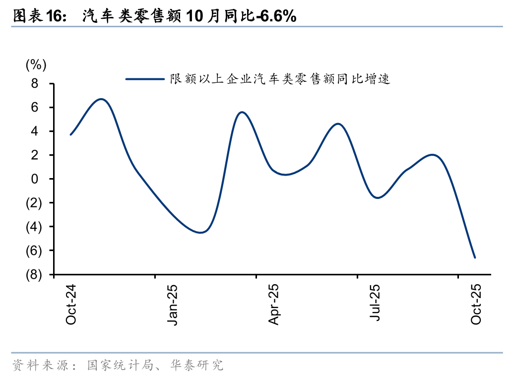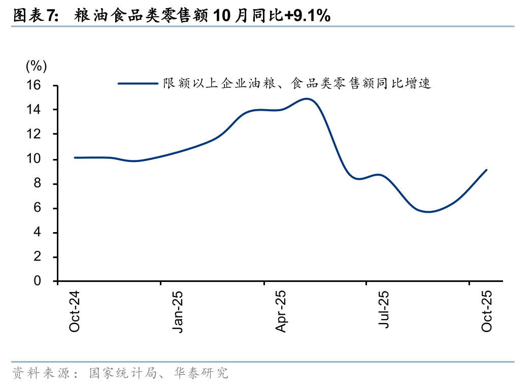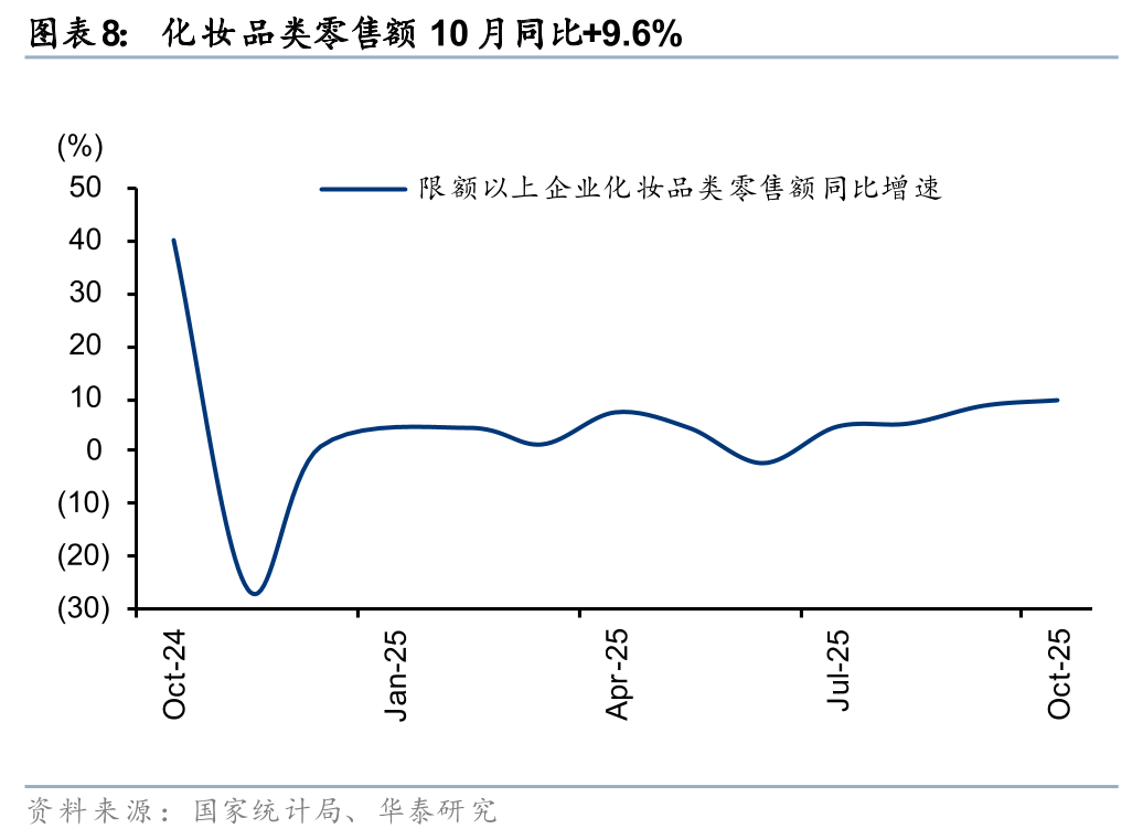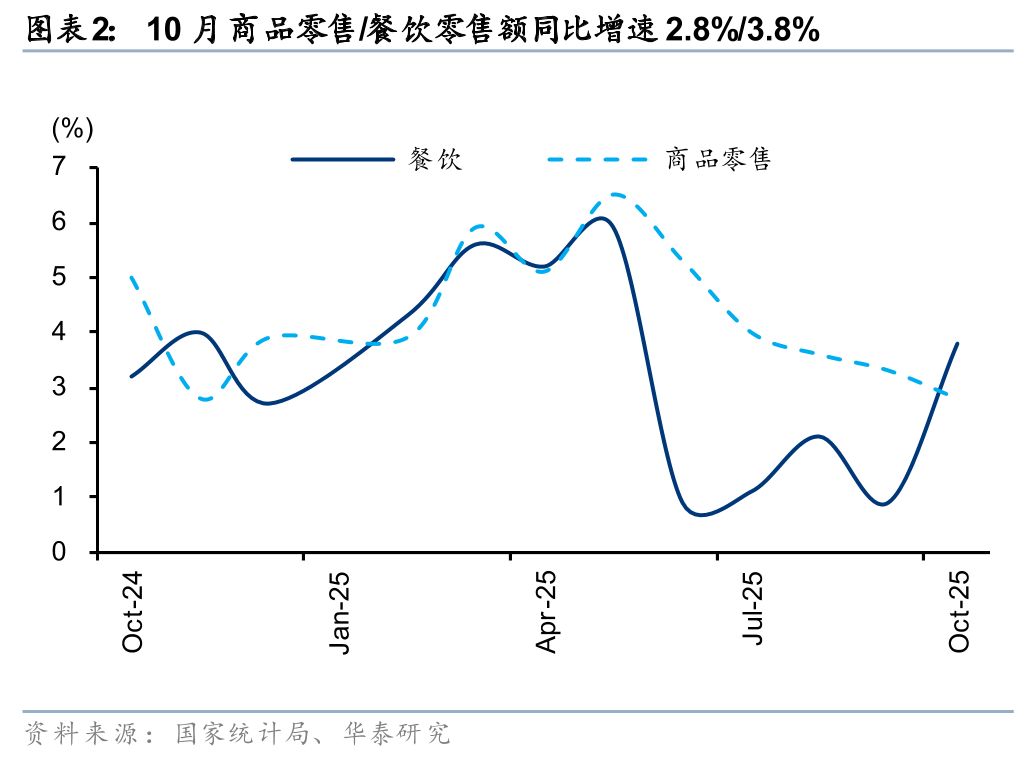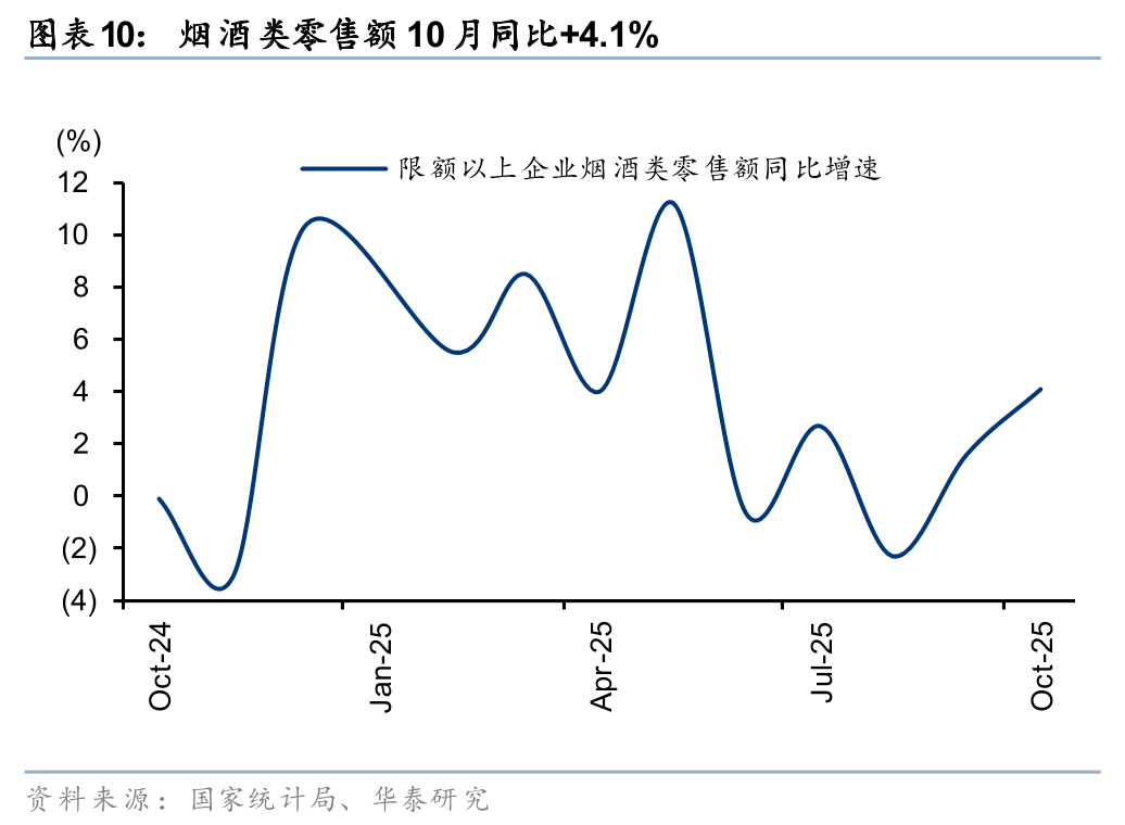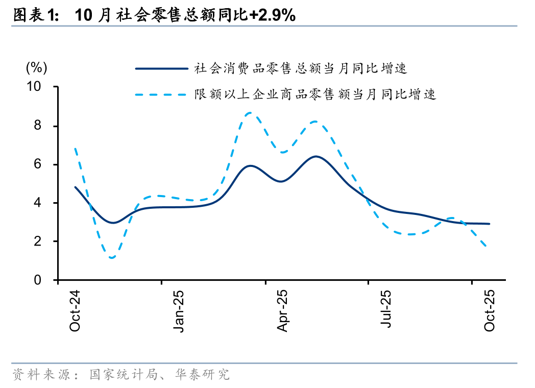 据国家统计局, 10月社零总额同增2.9%至 4.6万亿元,略高于Wind一致预期(2.7%),增速较9月-0.1pct,增速放缓主要受汽车、家电等降速的影响,除汽车外的消费品零售额同增4.0%。10月得益于中秋国庆双节的假日经济效应,以及“双十一”大促周期提前,基本生活类商品销售增势向好,金价新高带动投资型需求高增。展望后续,“十五五”规划延续扩内需、促消费的政策方针,在内需温和修复的背景下,品类或继续呈现分化趋势,建议关注情绪消费、国货崛起、AI+消费、银发经济等结构性机会。