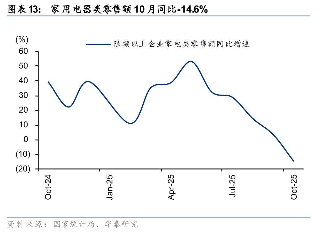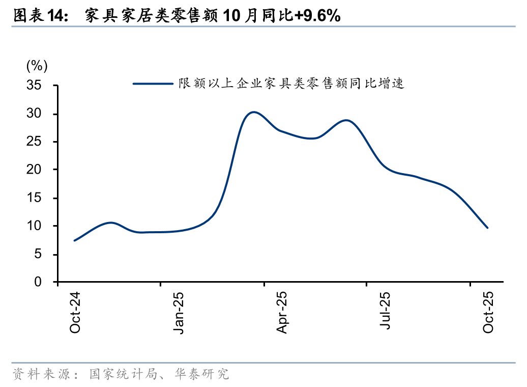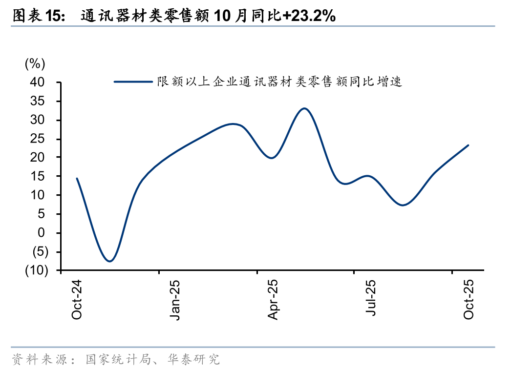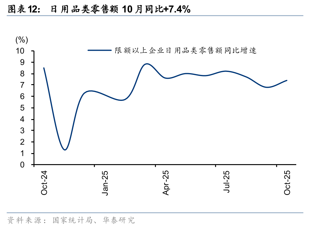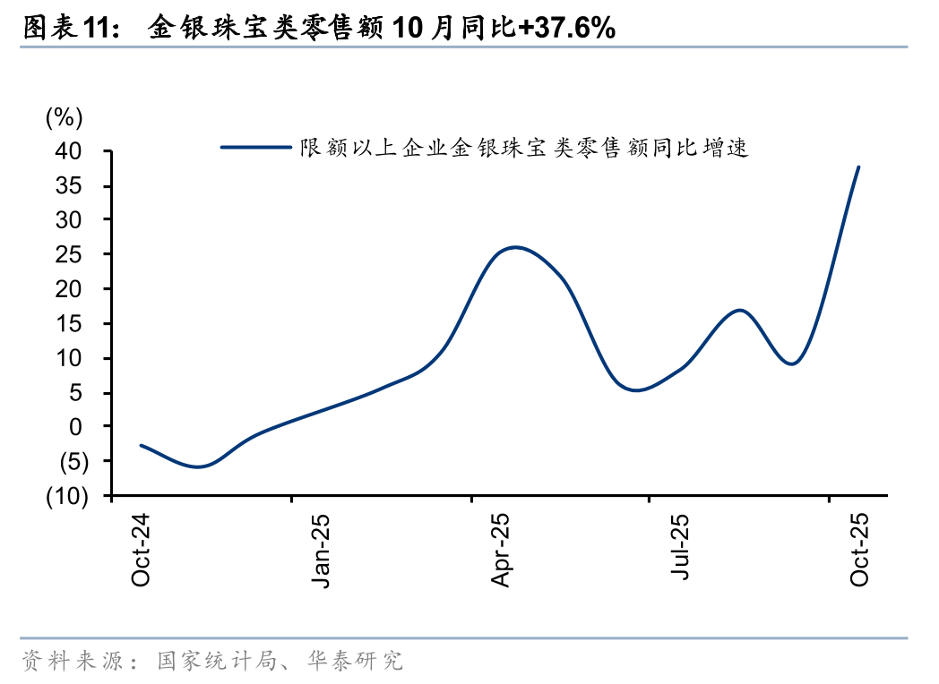 10月可选品类延续结构性分化:1)国补相关品类中,家具/通讯器材/家电分别同比+9.6/+23.2%/-14.6%,增速环比-6.6/+7.0/-17.9pct,家电类放缓主因基数抬升,以及第四期以旧换新资金衔接存在空窗期;2)体育娱乐用品、文化办公用品分别同增10.1%/13.5%,情绪、体验型消费延续高景气,中秋国庆连假带动出行相关需求;3)金银珠宝同增37.6%,国际金价10月创历史新高,强化投资保值属性,消费者避险投资需求带动;4)化妆品/鞋服针纺同比+9.6%/+6.3%,受“双十一”大促周期前置和延长影响,需求提前释放。