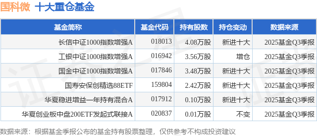 根据2025基金Q3季报公募基金重仓股数据,重仓该股的公募基金共6家,其中持有数量最多的公募基金为长信基金的长信中证1000指数增强A。长信中证1000指数增强A目前规模为3.2亿元,最新净值1.4178(11月19日),较上一交易日下跌0.89%,近一年上涨40.99%。该公募基金现任基金经理为左金保。左金保在任的基金产品包括:长信量化中小盘股票A,管理时间为2015年3月13日至今,期间收益率为143.29%;长信量化先锋混合A,管理时间为2015年3月13日至今,期间收益率为102.99%;长信电子信息量化灵活配置混合A,管理时间为2016年7月27日至今,期间收益率为56.0%;长信量化多策略股票A,管理时间为2018年8月30日至今,期间收益率为80.45%。