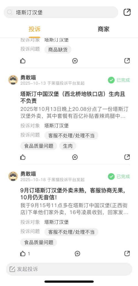 到了2025年8月,依旧有消费者向媒体爆料提到,在塔斯汀中国汉堡(济南天桥丹凤街店)购买的汉堡中吃出生肉。找店员询问,对方却不承认,称是肥肉,找塔斯汀官方渠道也没得到妥善处理。