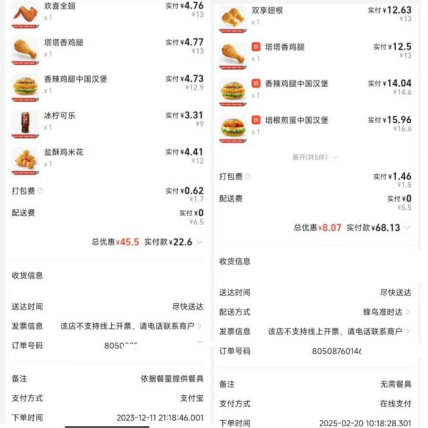 有消费者在小红书上晒了2023年、2024年、2025年三年的塔斯汀外卖消费记录,其在2023年12月的订单中,香辣鸡腿中国汉堡标价12.9元,实付4.73元(另有一次实付6.06元);塔塔香鸡翅标价13元,实付4.77元。
