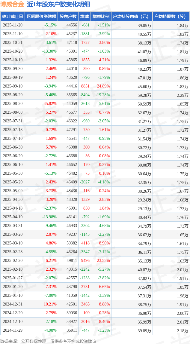从股价来看,2025年11月10日至2025年11月20日,博威合金区间跌幅为5.15%,在此期间股东户数减少681.0户,减幅为1.51%。