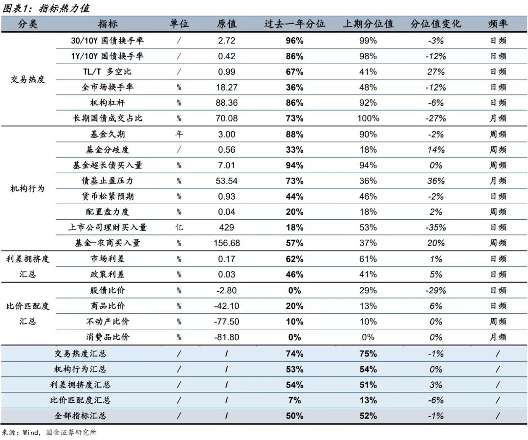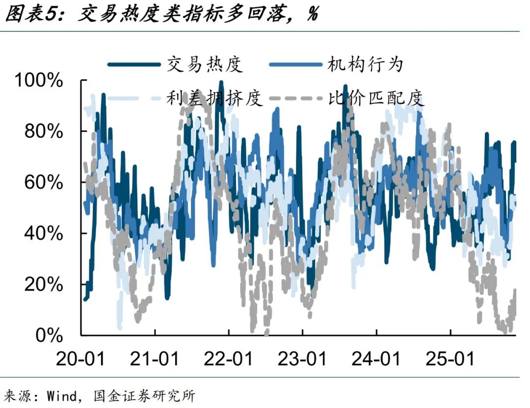 交易热度类指标多回落。①交易热度中,1/10Y国债换手率、全市场换手率、机构杠杆、30/10Y国债换手率分位值分别下降12、12、6、3个百分点,仅TL/T多空比分位值上升27个百分点,交易热度分位均值回落1个百分点。②机构行为类指标中,基金-农商买入量、基金分歧度、分位值回升20、14个百分点,上市公司理财买入量分位值下降35个百分点。机构行为分位均值基本持平前期。③市场利差回升1个百分点、政策利差分位值上升5个百分点,利差分位均值上升3个百分点。④股债比价分位值大幅回落29个百分点,商品比价分位值上升6个百分点,比价分位均值回落6个百分点。