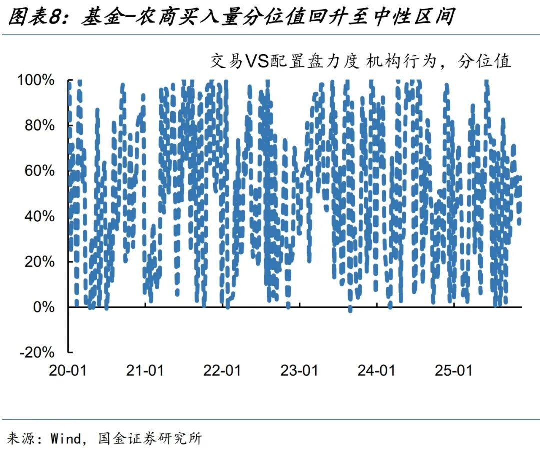 本期机构行为类指标中,位于过热区间的指标数量占比仍为38%,位于中性区间的指标数量占比仍为25%,位于偏冷区间的指标数量占比仍为38%。其中基金-农商买入量分位值回升20个百分点至57%、由偏冷区间升至中性区间。具体地: