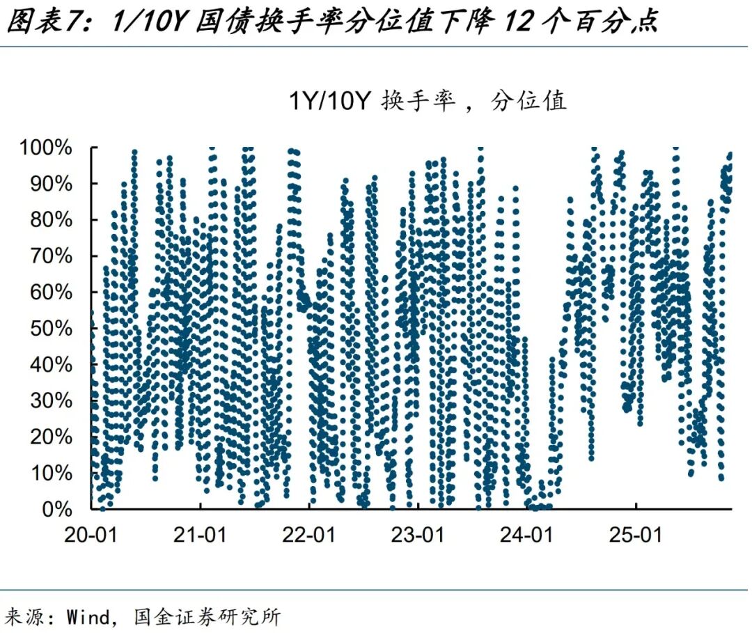 ⑥长期国债成交占比(过热):2025年10月长期国债成交占比较上期回落4个百分点至70.8%,过去一年分位值明显下降27个百分点至73%。