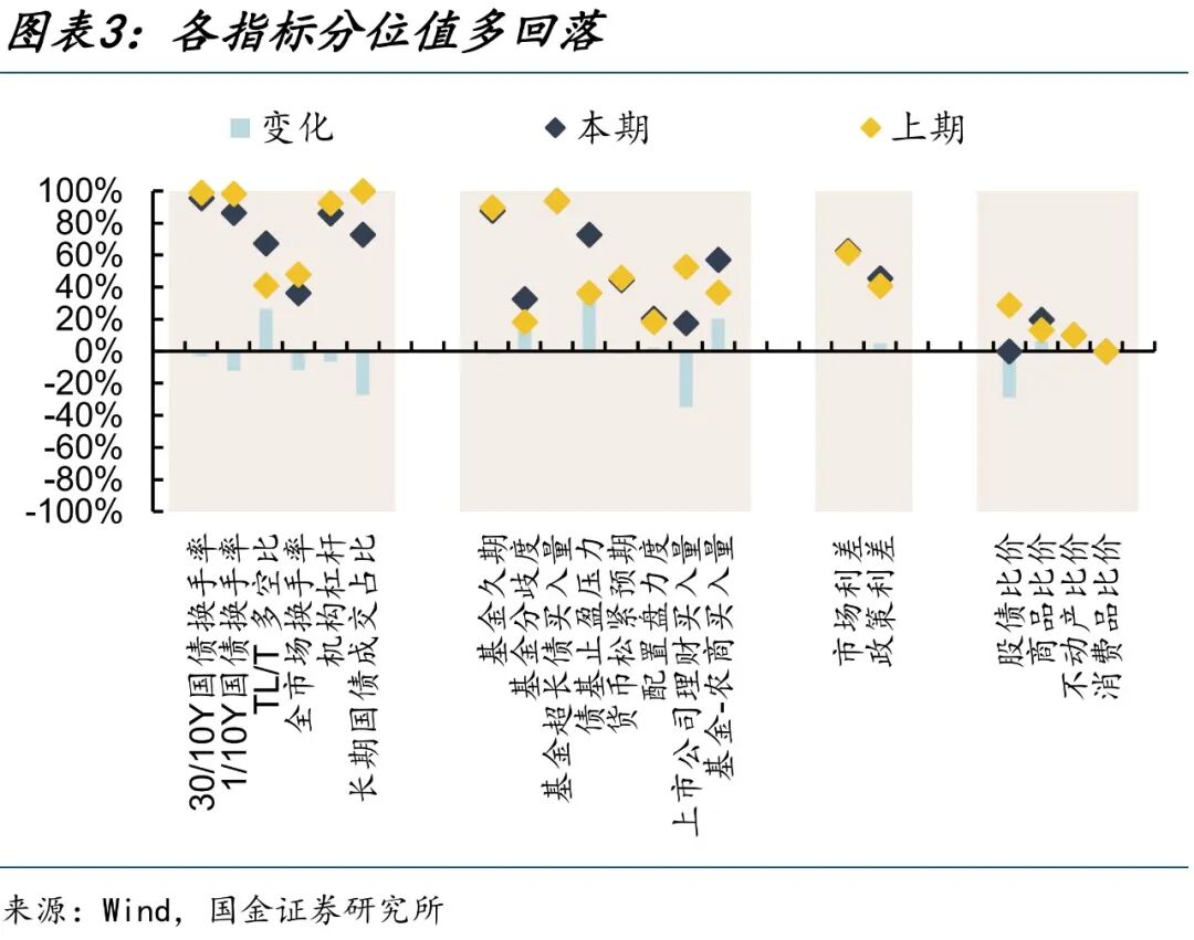 ①交易热度中,1/10Y国债换手率、全市场换手率、机构杠杆、30/10Y国债换手率分位值分别下降12、12、6、3个百分点,仅TL/T多空比分位值上升27个百分点,交易热度分位均值回落1个百分点。②机构行为类指标中,基金-农商买入量、基金分歧度、分位值回升20、14个百分点,上市公司理财买入量分位值下降35个百分点。机构行为分位均值基本持平前期。③市场利差回升1个百分点、政策利差分位值上升5个百分点,利差分位均值上升3个百分点。④股债比价分位值大幅回落29个百分点,商品比价分位值上升6个百分点,比价分位均值回落6个百分点。