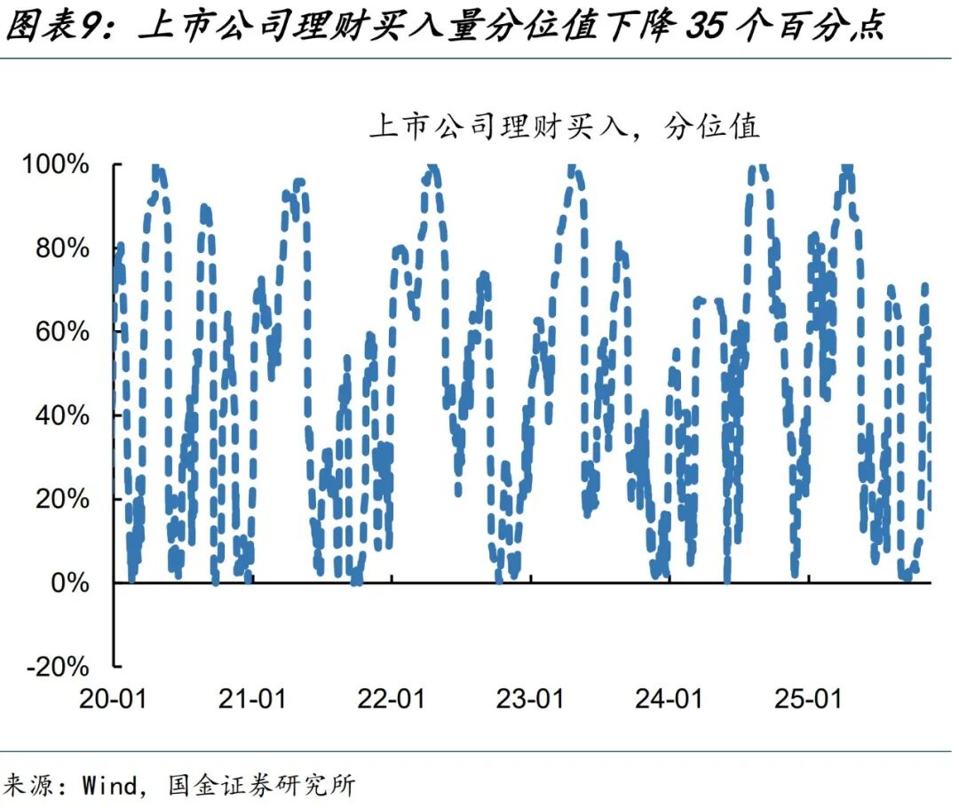 ⑥上市公司理财买入量(中性):本期上市公司理财买入量继续下降至429亿,过去一年分位值读数下降35个百分点至18%。