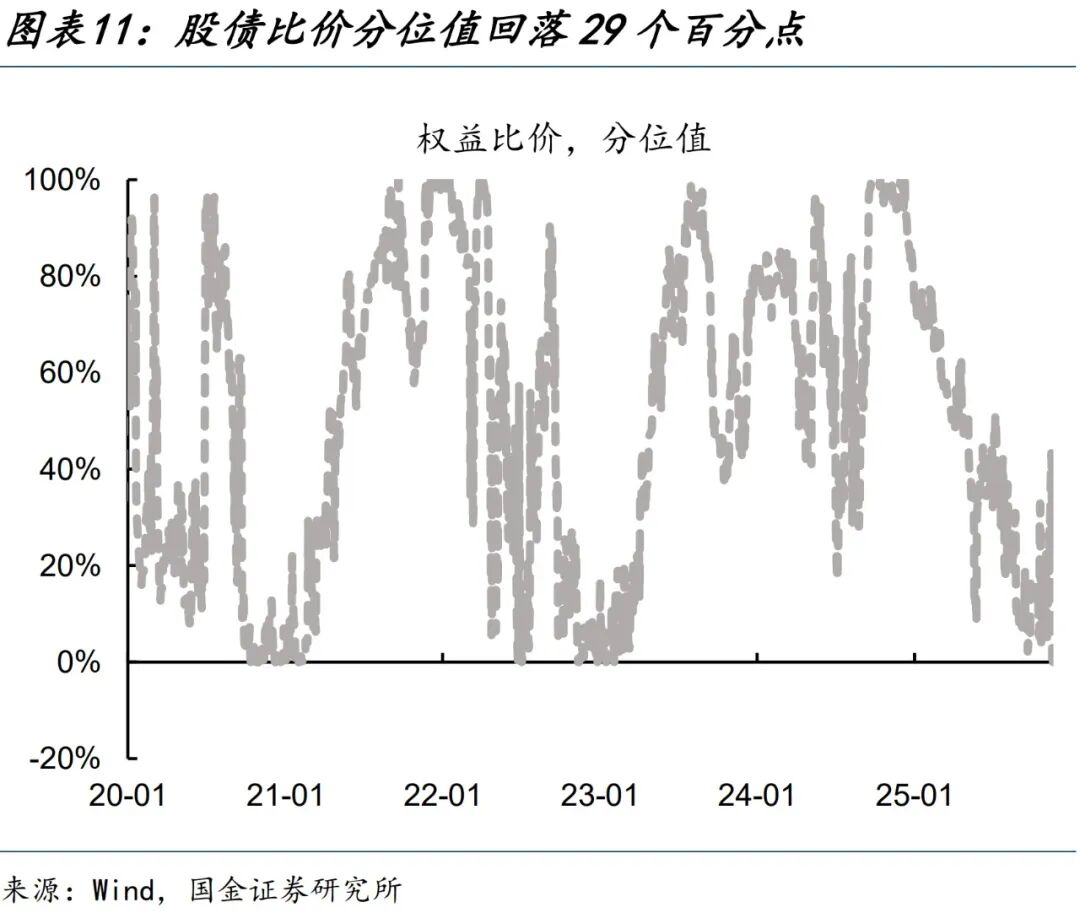 ①股债比价(偏冷):本期股市转为下跌,股债比价较前期下降22个百分点至-2.8%,过去一年分位值转为回落29个百分点至0%。