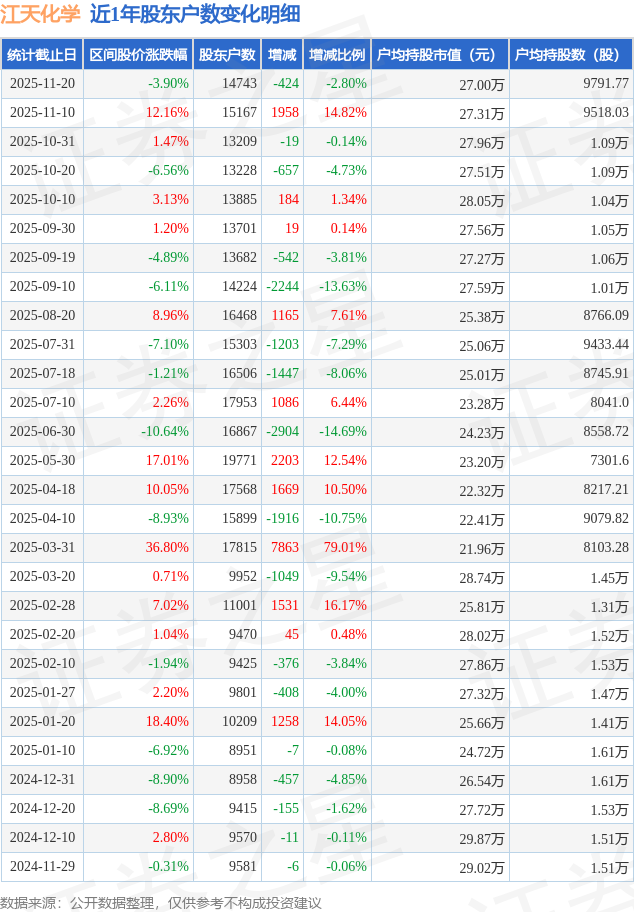 从股价来看,2025年11月10日至2025年11月20日,江天化学区间跌幅为3.9%,在此期间股东户数减少424.0户,减幅为2.8%。