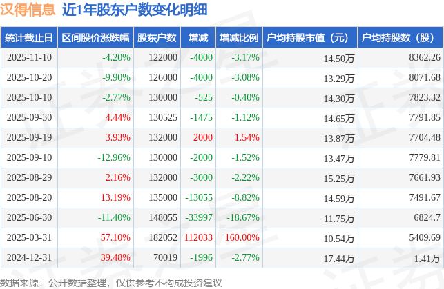 从股价来看,2025年10月31日至2025年11月10日,汉得信息区间跌幅为4.2%,在此期间股东户数减少4000.0户,减幅为3.17%。