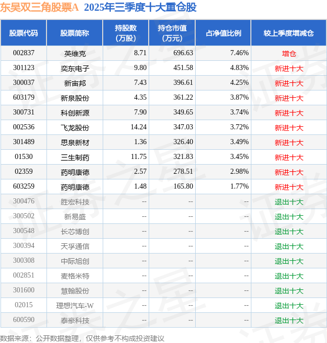 根据2025基金Q3季报公募基金重仓股数据,重仓该股的公募基金共1家,其中持有数量最多的公募基金为东吴基金的东吴双三角股票A。东吴双三角股票A目前规模为0.23亿元,最新净值0.6288(11月20日),较上一交易日下跌0.05%,近一年下跌13.45%。该公募基金现任基金经理为陈伟斌。