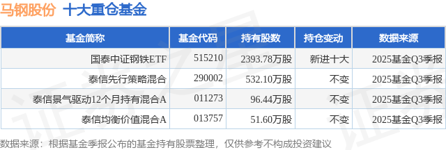 根据2025基金Q3季报公募基金重仓股数据,重仓该股的公募基金共4家,其中持有数量最多的公募基金为国泰基金的国泰中证钢铁ETF。国泰中证钢铁ETF目前规模为36.6亿元,最新净值1.5121(11月20日),较上一交易日下跌0.09%,近一年上涨25.21%。该公募基金现任基金经理为吴中昊。吴中昊在任的基金产品包括:国泰中证500指数增强A,管理时间为2022年1月28日至今,期间收益率为23.88%;国泰中证内地运输主题ETF,管理时间为2022年11月30日至今,期间收益率为-1.68%;国泰沪深300指数增强A,管理时间为2022年12月30日至今,期间收益率为17.09%;国泰国证新能源汽车指数C,管理时间为2022年12月30日至今,期间收益率为17.51%。