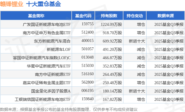 重仓赣锋锂业的前十大公募基金请见下表: