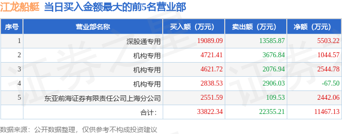 证券之星消息,沪深交易所2025年11月21日公布的交易公开信息显示,江龙船艇(300589)因日换手率达到30%的前5只证券登上龙虎榜。此次是近5个交易日内第5次上榜。