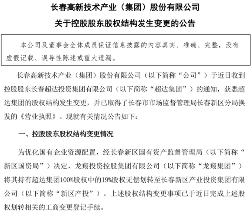 长春高新发布公告称,公司控股股东长春超达投资集团有限公司(下称超达集团)19%股权将由龙翔投资控股集团有限公司无偿划转至长春新区产业投资集团有限公司。调整变更前,龙翔集团持有超达集团100%股权,划转后,龙翔集团与新区产投分别持有超达集团81%与19%的股权。从股权结构来看,上述股权变更并未改变超达集团的控股股东地位,长春高新实际控制人仍为新区国资局。