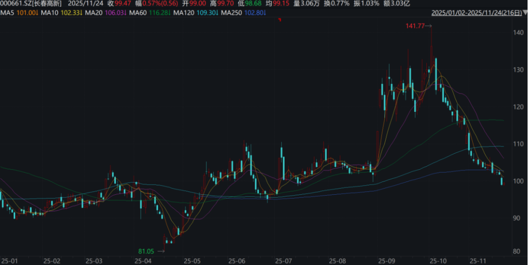 不过,受集采降价和生长激素市场竞争加剧影响,公司此后股价连续四年下跌。截至2025年11月24日午盘,长春高新股价报98.79元/股(不复权),总市值约为403亿元,较2021年最高值已蒸发超1700亿元。