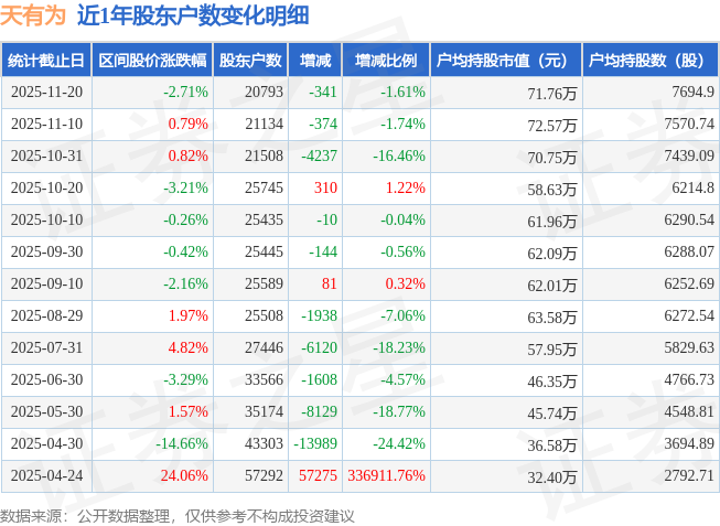 从股价来看,2025年11月10日至2025年11月20日,天有为区间跌幅为2.71%,在此期间股东户数减少341.0户,减幅为1.61%。