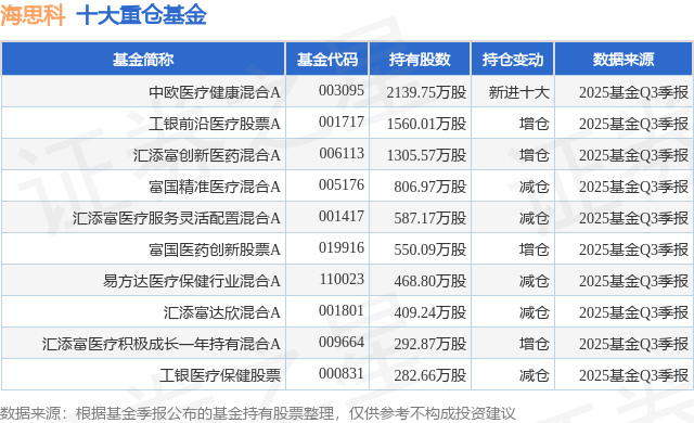 根据2025基金Q3季报公募基金重仓股数据,重仓该股的公募基金共41家,其中持有数量最多的公募基金为中欧基金的中欧医疗健康混合A。中欧医疗健康混合A目前规模为169.77亿元,最新净值1.827(11月21日),较上一交易日下跌1.92%,近一年上涨9.39%。该公募基金现任基金经理为葛兰 赵磊。葛兰在任的基金产品包括:中欧明睿新起点混合,管理时间为2018年7月12日至今,期间收益率为65.21%;中欧医疗创新股票A,管理时间为2019年2月28日至今,期间收益率为52.51%。赵磊在任的基金产品包括:中欧医药生物混合发起A,管理时间为2025年11月14日至今,期间收益率为nan%。