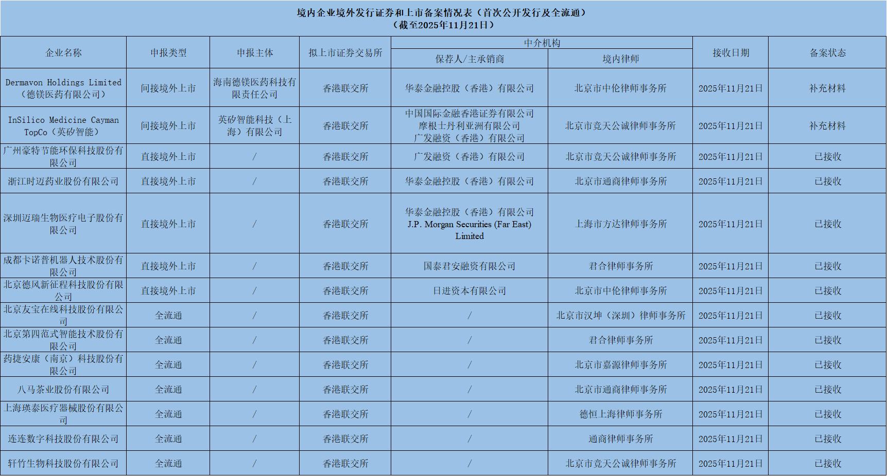 智通财经APP获悉,11月21日,中国证监会发布境内企业境外发行证券和上市备案情况表(首次公开发行及全流通)(截至2025年11月21日)。本周(11月17日-11月21日),其中,德镁医药备案状态为补充材料;豪特节能、时迈药业、迈瑞生物、卡诺普机器人、德风科技等公司拟香港IPO获中国证监会接收材料;友宝在线(02429)、药捷安康(02617)、八马茶业(06980)、瑛泰医疗(01501)、连连数字(02598)等公司股份全流通获中国证监会接收材料。