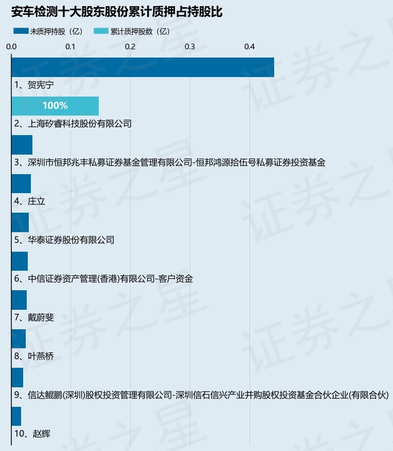 截止本公告日,股东上海硅睿科技股份有限公司已累计质押股份1472.24万股,占其持股总数的100.0%。本次质押后安车检测十大股东的累计质押股份占持股比例(占持股比例的计算以公司最新一期财务报表公布的十大股东的持股总数为基准)见下图:
