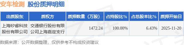 证券之星消息,安车检测(300572)11月21日公开信息显示,股东上海硅睿科技股份有限公司向交通银行股份有限公司上海嘉定支行合计质押1472.24万股,占总股本6.43%。质押详情见下表: