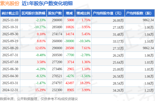 证券之星消息,近日紫光股份披露,截至2025年11月10日公司股东户数为29.0万户,较10月31日增加5000.0户,增幅为1.75%。户均持股数量由上期的1.0万股减少至9862.0股,户均持股市值为26.09万元。