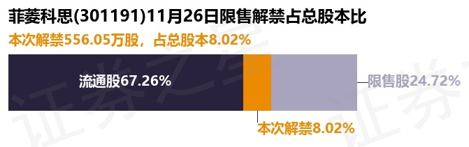 证券之星消息,根据市场公开信息整理,菲菱科思(301191)于11月26日将有556.05万股限售股份解禁,为公司追加承诺限售股份上市流通,占公司总股本8.02%。(本次数据根据历史公告整理得出,实际情况以上市公司最新公告为准)最近一年内,该股累计解禁1910.79万股,占总股本的27.56%。本次解禁后,公司还有1714.36万股限售股份,占总股本24.72%。具体如下图所示: