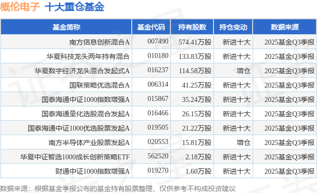 根据2025基金Q3季报公募基金重仓股数据,重仓该股的公募基金共14家,其中持有数量最多的公募基金为南方基金的南方信息创新混合A。南方信息创新混合A目前规模为34.77亿元,最新净值2.3911(11月26日),较上一交易日上涨0.8%,近一年上涨32.2%。该公募基金现任基金经理为郑晓曦。郑晓曦在任的基金产品包括:南方科创板3年定开混合,管理时间为2024年1月12日至今,期间收益率为67.33%;南方半导体产业股票发起A,管理时间为2024年4月30日至今,期间收益率为85.59%。