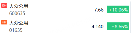 11月25日,大众公用H股盘中涨超8%,A股涨停,市场再追捧摩尔线程概念。