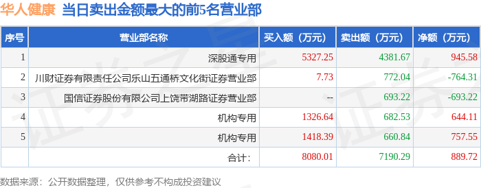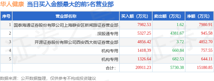 证券之星消息,沪深交易所2025年11月26日公布的交易公开信息显示,华人健康(301408)因日涨幅达到15%的前5只证券登上龙虎榜。此次是近5个交易日内第1次上榜。