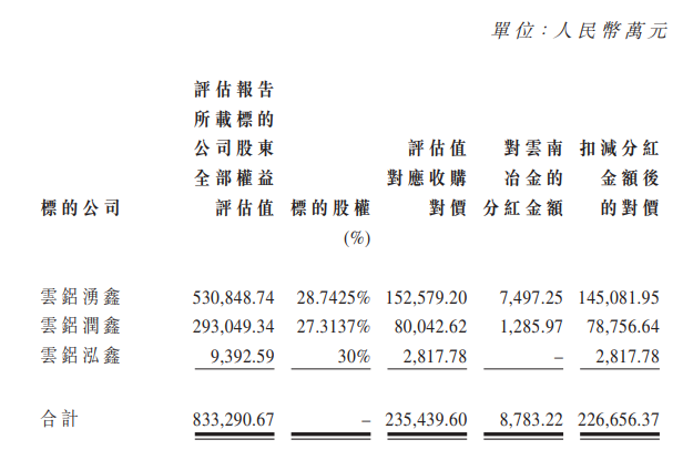 智通财经APP了解到,11月25日,中国铝业控股子公司云南铝业拟收购云南冶金持有的云铝涌鑫28.7425%股权、云铝润鑫27.3137%股权及云铝泓鑫30%股权。此次收购总交易对价22.67亿元,并分两期支付,完成收购后,云铝股份将持有上述三家标的股权分别为96.0766%,97.4560%及100%。