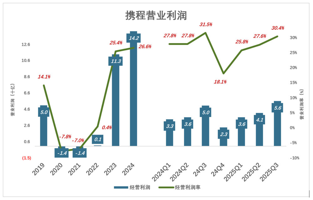 2019年,携程毛利润率79.3%,仅比2025年前三季度低1.8个百分点。但经营利润率仅为14.1%,刚好是2025年前三季度的一半,根本原因是总费用率下降了12.3个百分点。