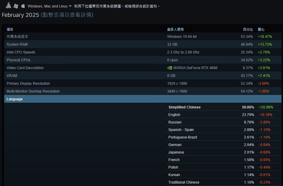2 月份 Valve 的报告显示,Steam 上简体中文用户数量环比增长 20.88%,达到了 50.06%,是不折不扣的第一大玩家群体,作为对比,2 月份英文用户只有 23.79%。