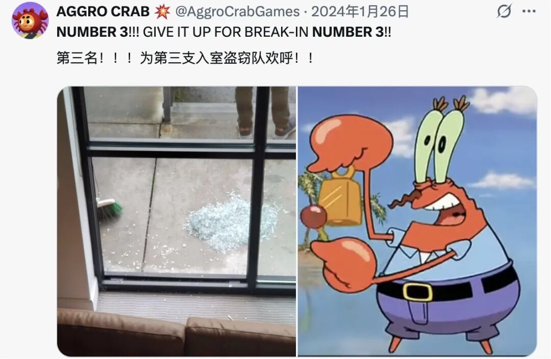 开发《蟹蟹寻宝奇遇》的西雅图独立游戏公司 Aggro Crab,在 2024 年 1 月的时候还接受采访,说当时工作室的资金已经完全枯竭,在同一月内还遭到了 3 次入室盗窃,公司里的 Xbox、硬盘都被零元购了。