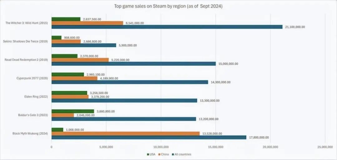 Reddit 上的国外玩家通过 Gamelytic 的销量数据,制作出了一张 Steam 端销量对比表格,上边显示有很多近年热门的 3A 游戏,在中国市场的销量几乎是美国市场的好几倍。