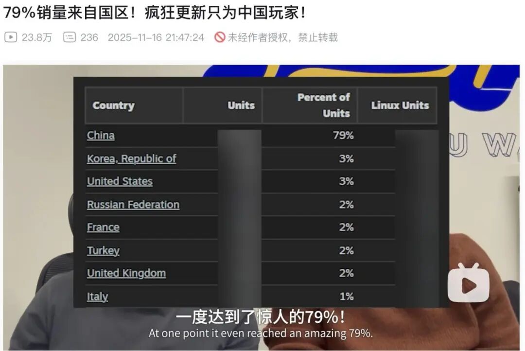 今年上半年,土耳其两兄弟开发的《菜市场模拟器》,在测试的时候销量不到一千套,结果被中国玩家关注后销量猛增。哥俩前几天还在 B 站发视频感谢中国玩家,标题就是 “ 79% 销量来自国区,疯狂更新只为中国玩家!”