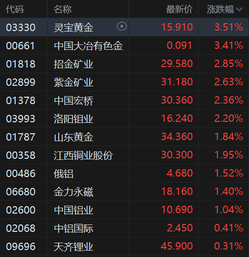 11月25日,港股有色金属股集体上涨,其中,灵宝黄金、中国大冶有色金属涨3.5%,招金矿业、紫金矿业涨近3%,中国宏桥、洛阳钼业涨超2%,山东黄金、江西铜业、俄铝、金力永磁、中国铝业纷纷上涨。