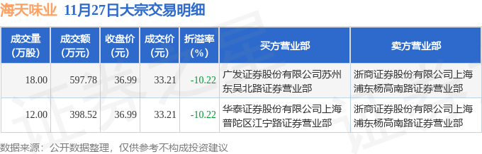 证券之星消息,11月27日海天味业发生大宗交易,交易数据如下: