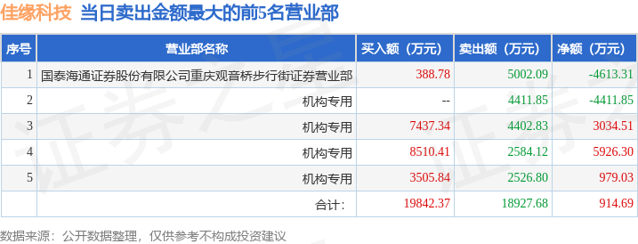 证券之星消息,沪深交易所2025年11月27日公布的交易公开信息显示,佳缘科技(301117)因日换手率达到30%的前5只证券登上龙虎榜。此次是近5个交易日内第3次上榜。