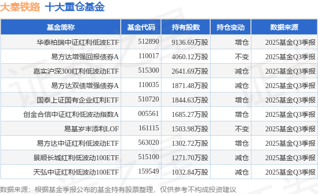根据2025基金Q3季报公募基金重仓股数据,重仓该股的公募基金共56家,其中持有数量最多的公募基金为华泰柏瑞基金的华泰柏瑞中证红利低波ETF。华泰柏瑞中证红利低波ETF目前规模为201.64亿元,最新净值1.2021(11月26日),较上一交易日下跌0.58%,近一年上涨12.06%。该公募基金现任基金经理为柳军。柳军在任的基金产品包括:华泰柏瑞上证红利ETF,管理时间为2009年6月4日至今,期间收益率为144.55%;华泰柏瑞沪深300ETF,管理时间为2012年5月4日至今,期间收益率为109.08%;华泰柏瑞沪深300ETF联接A,管理时间为2012年5月29日至今,期间收益率为125.59%;华泰MSCI中国A股国际通ETF,管理时间为2018年4月26日至今,期间收益率为77.11%。