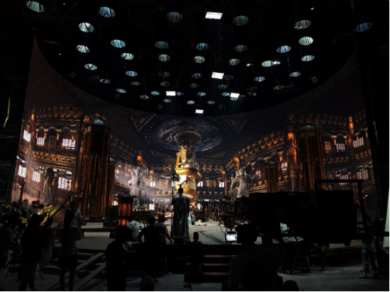 这座占地2500平米的虚拟影棚,是国内最先进的虚拟制作基地之一。在摄影棚内,一座由500多平方米LED屏幕环绕而成的圆形拍摄区赫然矗立。此外,三台摄影机在跟踪系统的精准调度下可以同步运转,灯光系统与虚拟场景实时联动,营造出逼真的光影氛围。而导演和摄影指导只需要坐在总控台前,像“上帝”一样把控画面中的每一个细节。