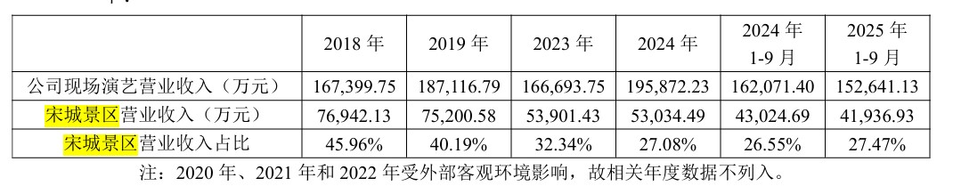 实际上,宋城景区是宋城演艺重要的营收来源,长期占据营收比重的30%左右。2023年-2025年1-9月,宋城演艺的营业收入分别为5.39亿元、5.30亿元、4.19亿元。
