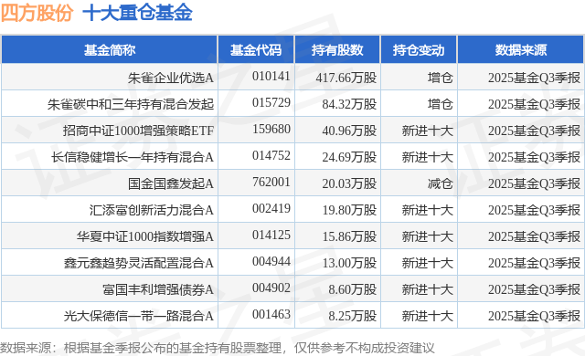 根据2025基金Q3季报公募基金重仓股数据,重仓该股的公募基金共18家,其中持有数量最多的公募基金为朱雀基金的朱雀企业优选A。朱雀企业优选A目前规模为18.01亿元,最新净值1.0124(11月24日),较上一交易日上涨0.96%,近一年上涨14.33%。该公募基金现任基金经理为郭涛 陈飞。陈飞在任的基金产品包括:朱雀企业优胜A,管理时间为2023年8月9日至今,期间收益率为6.53%;朱雀匠心一年持有,管理时间为2025年1月13日至今,期间收益率为16.01%;朱雀产业精选混合A,管理时间为2025年5月26日至今,期间收益率为6.49%;