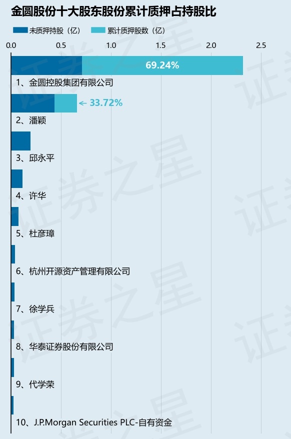 截止本公告日,股东金圆控股集团有限公司已累计质押股份1.61亿股,占其持股总数的69.24%,股东潘颖已累计质押股份2230.0万股,占其持股总数的33.72%。本次质押后金圆股份十大股东的累计质押股份占持股比例(占持股比例的计算以公司最新一期财务报表公布的十大股东的持股总数为基准)见下图: