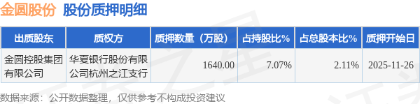 证券之星消息,金圆股份(000546)11月28日公开信息显示,股东金圆控股集团有限公司向华夏银行股份有限公司杭州之江支行合计质押1640.0万股,占总股本2.11%。质押详情见下表: