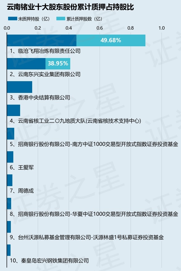 截止本公告日,股东临沧飞翔冶炼有限责任公司已累计质押股份4450.0万股,占其持股总数的49.68%,股东云南东兴实业集团有限公司已累计质押股份1600.0万股,占其持股总数的38.95%。本次质押后云南锗业十大股东的累计质押股份占持股比例(占持股比例的计算以公司最新一期财务报表公布的十大股东的持股总数为基准)见下图: