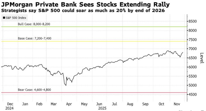 这家私人银行的乐观预测与其投资银行的股票研究团队的观点一致。策略师Dubravko Lakos-Bujas认为,标普500 指数将在 2026 年底从当前水平上涨约 10%至 7500 点,这得益于强劲的盈利增长以及美联储的降息举措——如果通胀降温能让官员们比预期更多次地放松货币政策,该指数甚至有可能达到 8000 点。