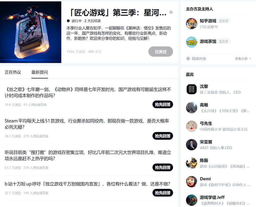 近期,由中国音数协游戏工委指导,知乎游戏与游戏茶馆联合推出的“匠心游戏·第三季:星河再启”圆桌活动即将收官。活动吸引了上百位从业者参与,围绕近200个核心问题,展开了一系列深度对话。