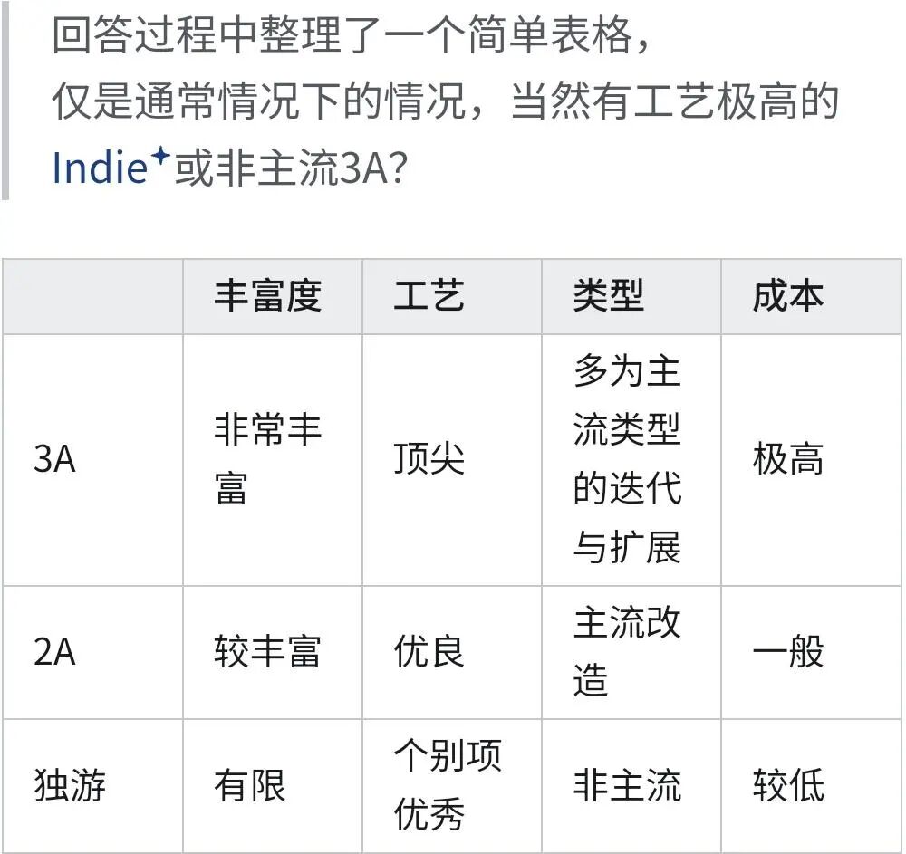 在铼三实验室创始人沈黎(知乎ID:沈黎)看来:“2A通常由中小型开发商制作,预算大多控制在一两千万美元。在局部表现和整体观感上接近3A水准,但游戏内容量明显少于3A;或者内容量尚可,但在细节打磨和整体质感上略低于3A。”